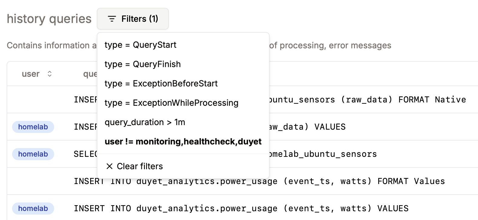 CLICKHOUSE_EXCLUDE_USER_DEFAULT: for examplemonitoring,healthcheck.